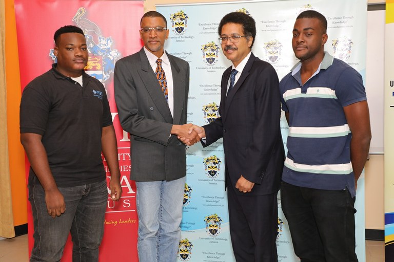 Professor Stephen Vasciannie, CD, (2nd right), President, University of Technology, Jamaica and Mr. Peter Harrison (2nd left), President, The Palisadoes Foundation shake hands following the donation of network equipment worth $12M* dollars to UTech, Jamaica and UWI, Mona. Sharing in the presentation from left are students Mr. Agyei Masters, School of Computing and Information Technology, UTech, Jamaica and and Mr. Mathew Stone, UWI graduate student.