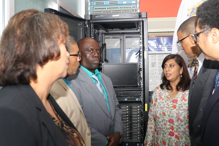 Examining the Network Equipment located at the Server Room in the main lab of the SCIT Building (from left) are Prof. Nizla Aples, Dean, Faculty of Engineering and Computing, UTech, Ja., Mr. Sheldon Powe, President, Jamaica Computer Society, Dr. Sean Thorpe, Head, School of Computing and Information Technology, UTech, Ja., Dr. Gunjan Mansingh, Head, Department of Computing, Faculty of Science and Technology, UWI, Mona, Mr. Peter Harrison, President, The Palisadoes Foundation and Professor Stephen Vasciannie, CD, President, University of Technology, Jamaica.